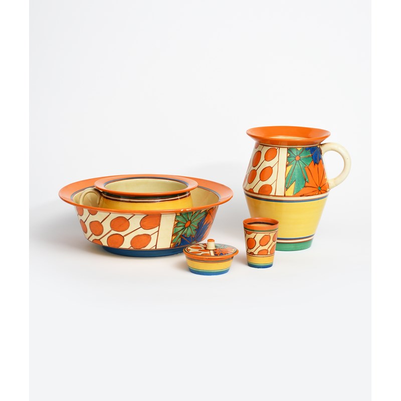 'Umbrellas and Rain' a Clarice Cliff Fantasque Bizarre wash set, painted in colours, comprising; single-handled Tolphin jug, wash basin, beaker, soap dish and cover, banded basin, printed factory marks, beaker restored, 24.5cm. high (Tolphin), 36.5cm. diam. (wash basin), (6)