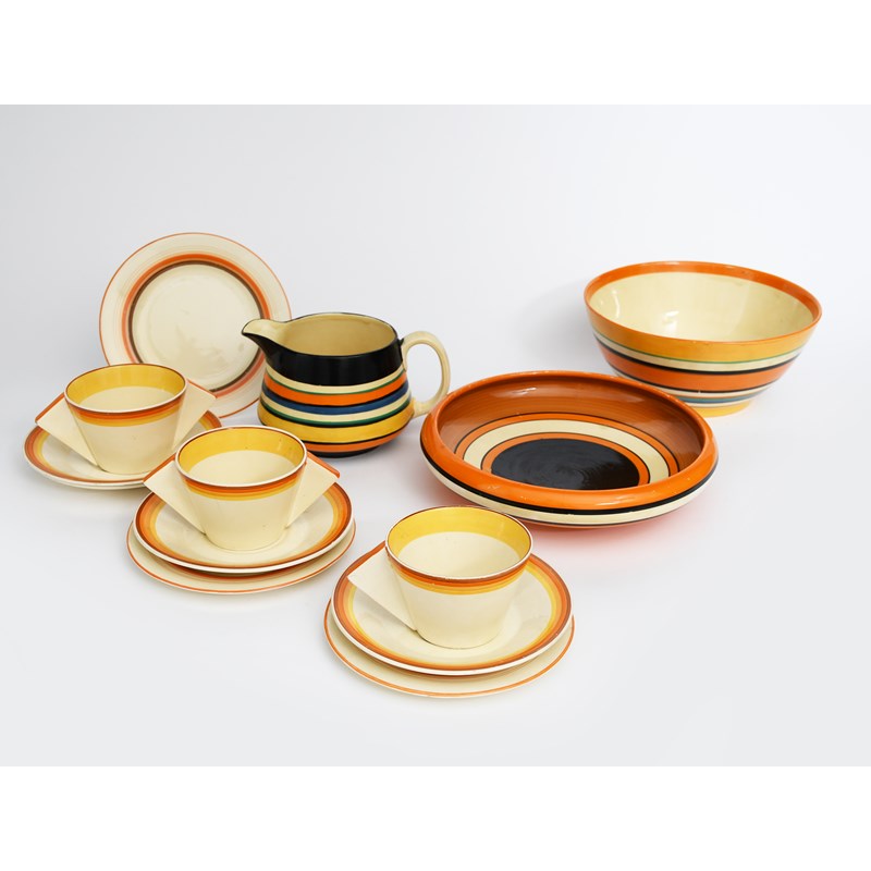'Liberty Band' a Clarice Cliff Bizarre jug, painted with bands in colours, a 'Liberty Band Hiawatha' bowl, another bowl a part conical tea service and a collection printed factory marks, 10.5cm. high (a lot)