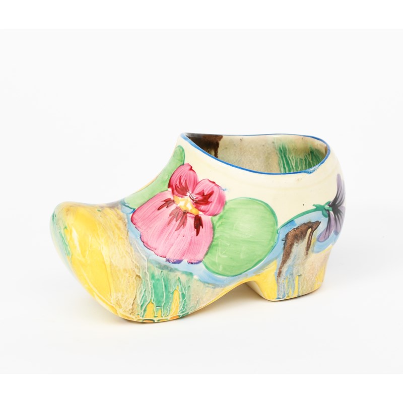 'Delecia Pansies' a Clarice Cliff Bizarre Clog, painted in colours printed factory mark, 13.5cm. wide