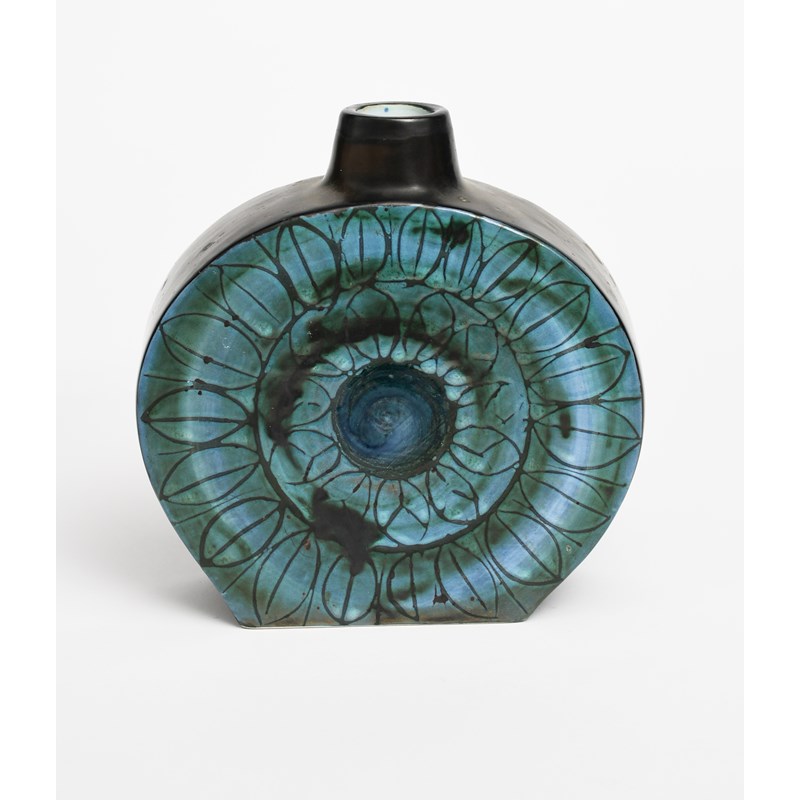 A Troika Pottery large Perfume Bottle designed by Benny Sirota disc form with solifleur aperture, painted with large flowerhead design in blue on a black ground, the reverse a small sun motif impressed Troika St Ives and trident mark, 16.8cm. high