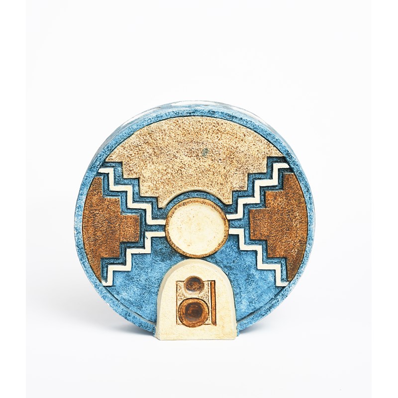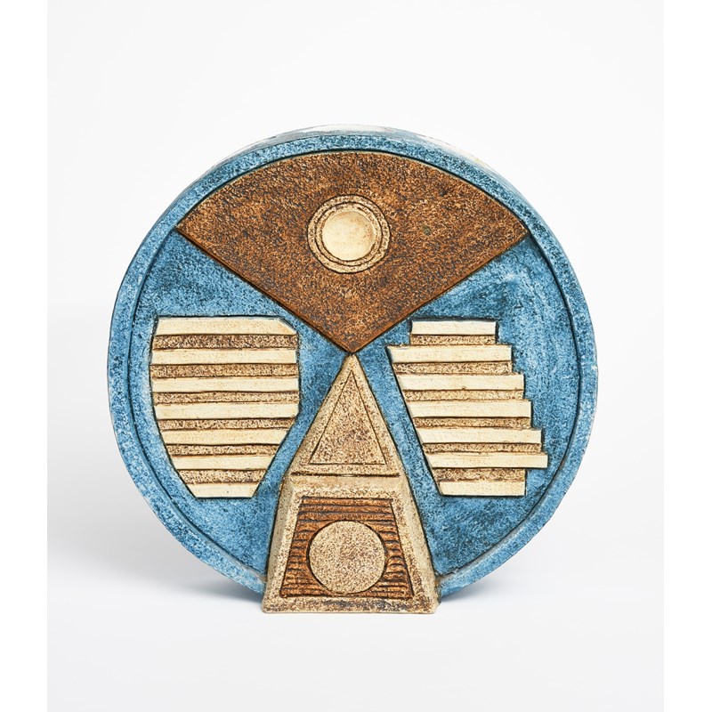 A Troika Pottery large Wheel vase by Avril Bennett, circular with three aperture, cast in low relief with geometric panels glazed tan, brown and blue, painted Troika Cornwall England and artist cipher, 32cm. high