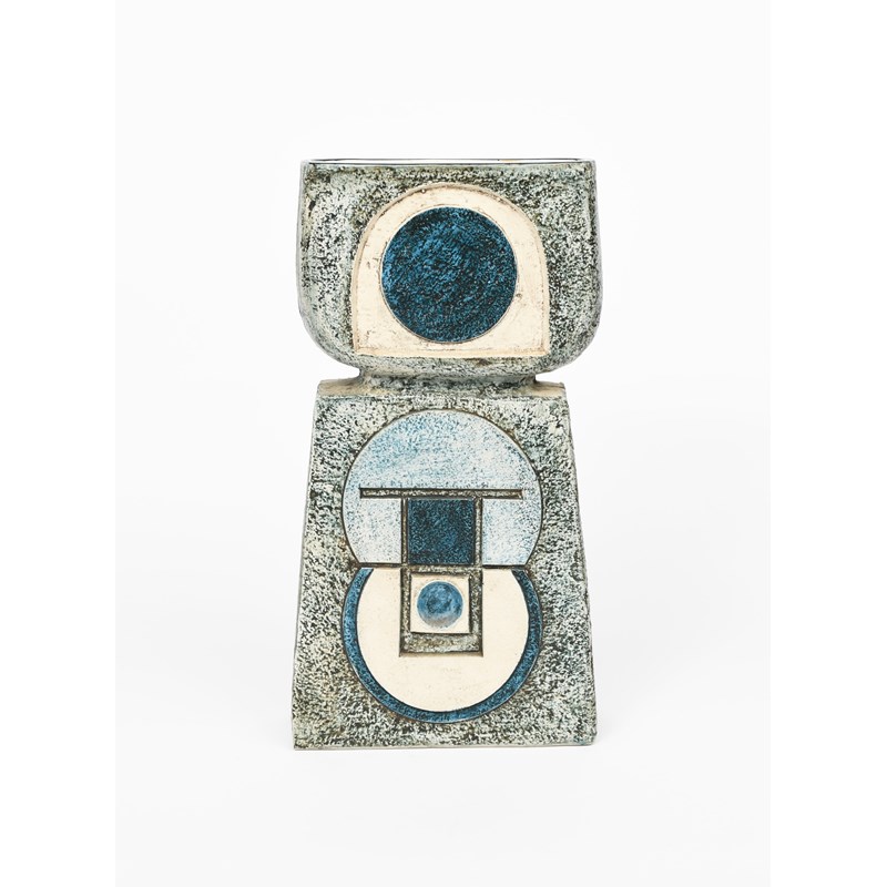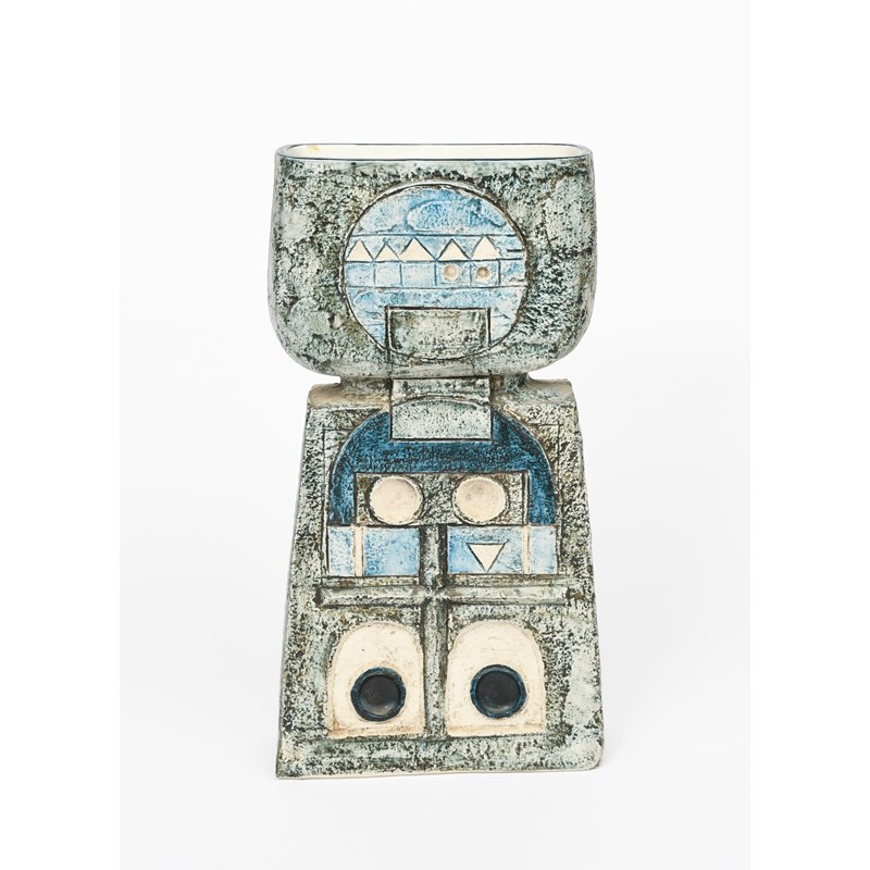 A Troika Pottery Double Base vase by Louise Jinks, cast in low relief with a stylised figure to each side in blue, green and buff painted Troika Cornwall, LJ monogram, 35.5cm. high