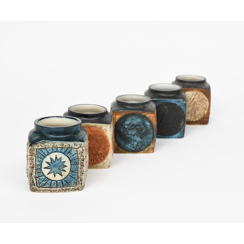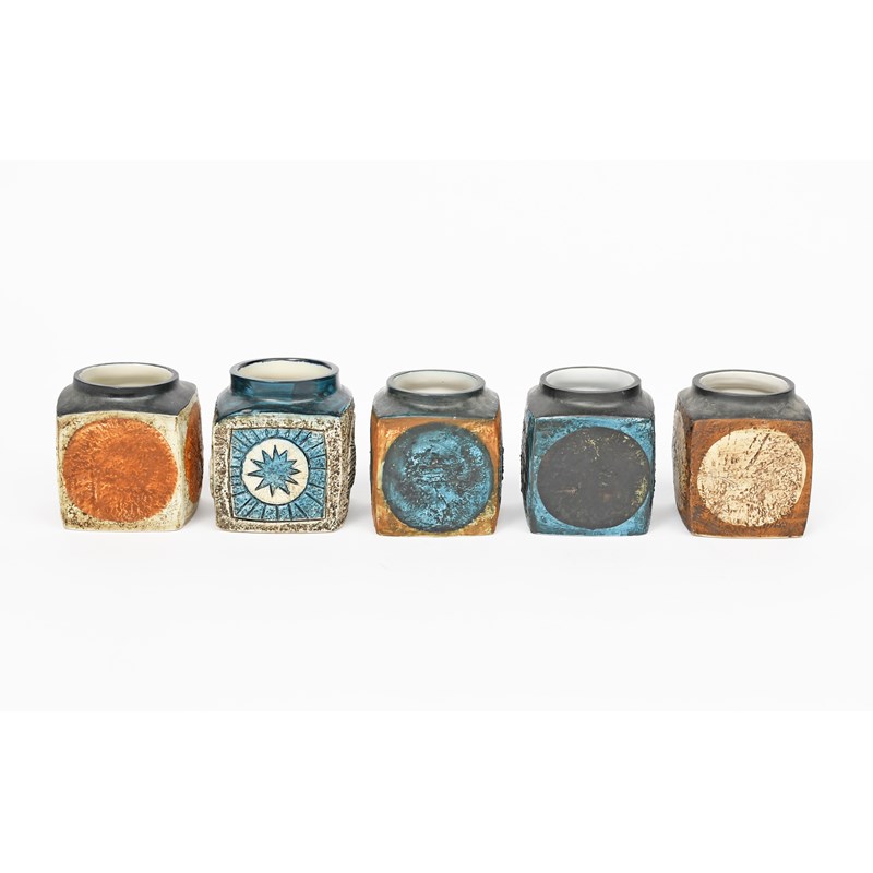 A Troika Pottery Marmalade Pot by Alison Brigden, square section with circular neck, modelled in low relief with geometric panels, in shades of blue and brown, and four other Troika Pottery Marmalade pots, painted marks, 9.5cm. high (5)