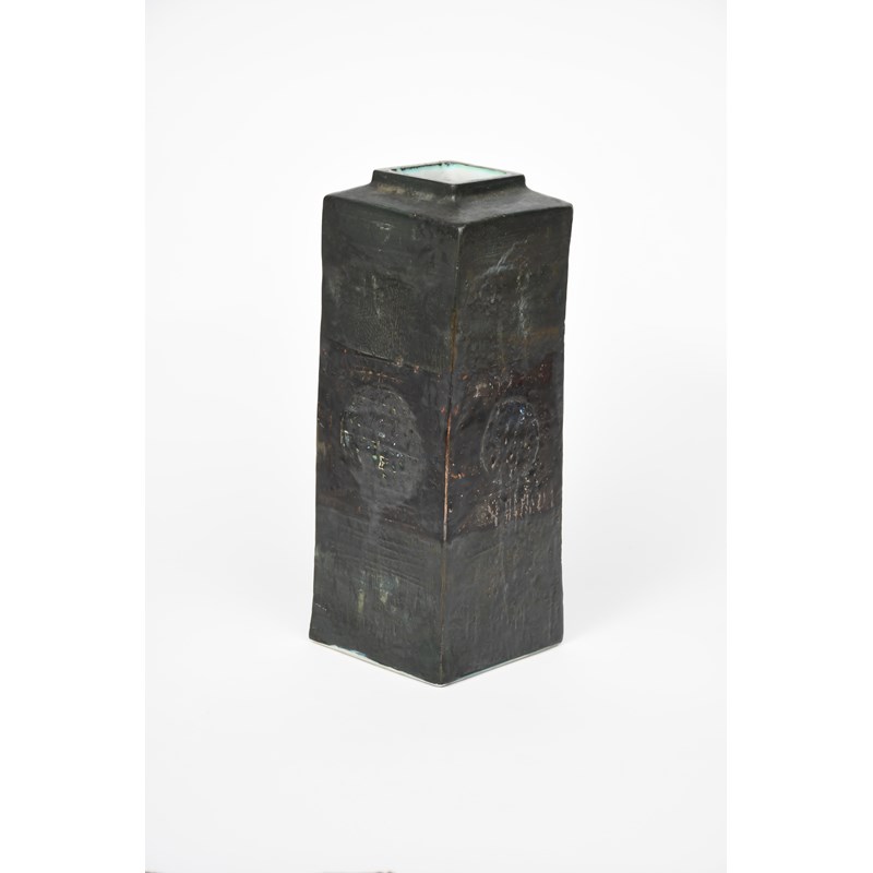 A Troika Pottery Column vase, rectangular form with square neck, modelled in low relief and painted with geometric panels in manganese painted Troika St Ives and trident mark, indistinct artist monogram, 30.5cm. high
