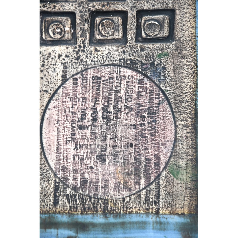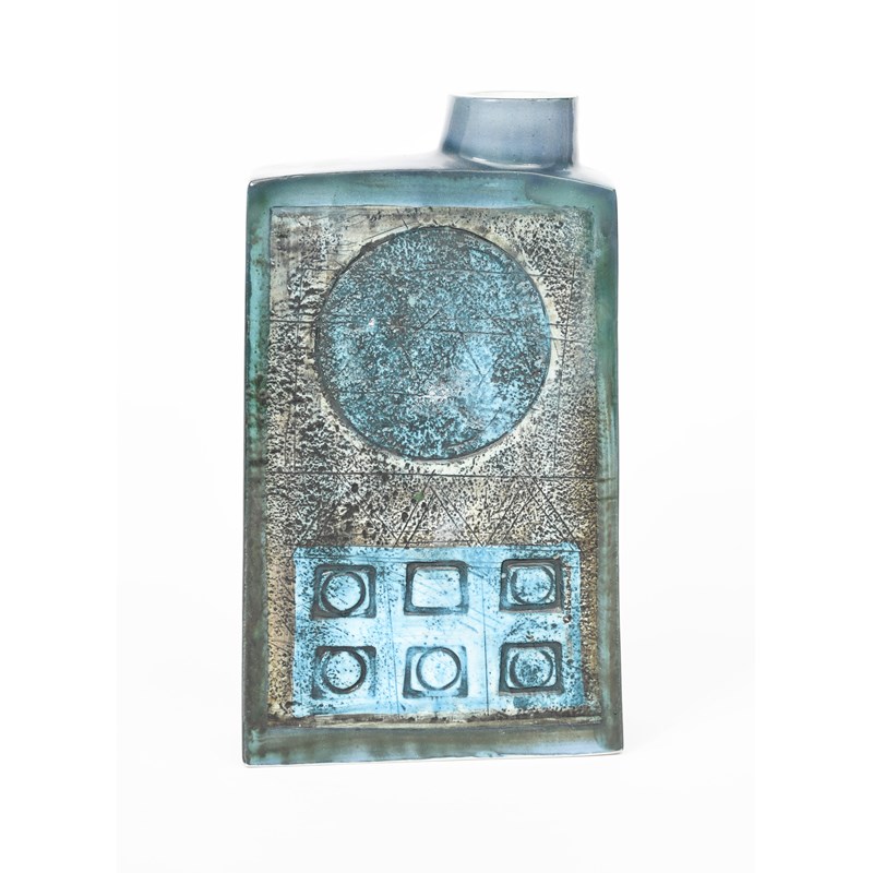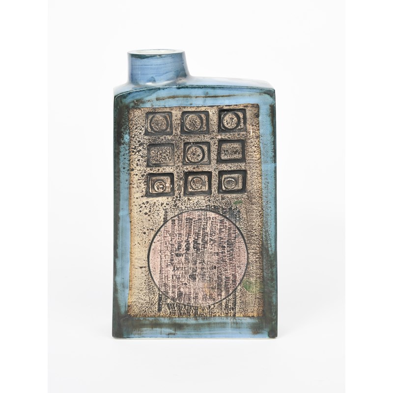 A Troika Pottery Shoulder Bottle vase, modelled in low relief with geometric keypad design to both sides, in shades of brown and blue with blue shoulder, painted Troika St Ives England to base, 20cm. high
