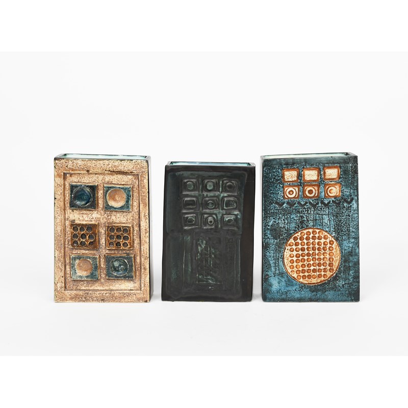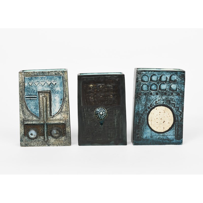 A Troika Pottery rectangular vase by Linda Taylor, moulded in low relief with a geometric mask design in blue and manganese on a green ground, another Troika vase similar, and an early Troika vase with wheel design covered in a black glazed painted marks, early vase professionally restored, 17.5cm. high (3)