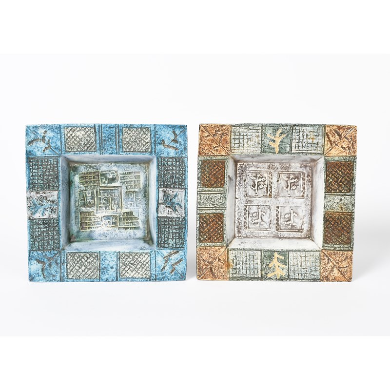 A Troika Pottery square dish by Jane Fitzgerald, cast to the rim and well with square panels, glazed lavender and blue, and another similar by Jane Fitzgerald, painted Troika Cornwall and JF monogram, 19cm. square (2)