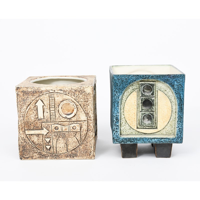 A Troika Pottery footed Cube vase by Avril Bennett, square section, cast in low relief with geometric panels to front and back, glazed in tan, green and blue on a blue ground, the feet glazed manganese, and another Troika Pottery Flower Pot vase vase painted Troika AB to one foot, 18cm. high (2)
