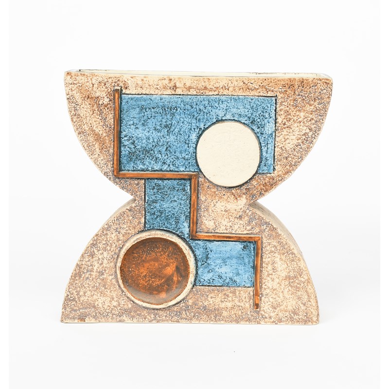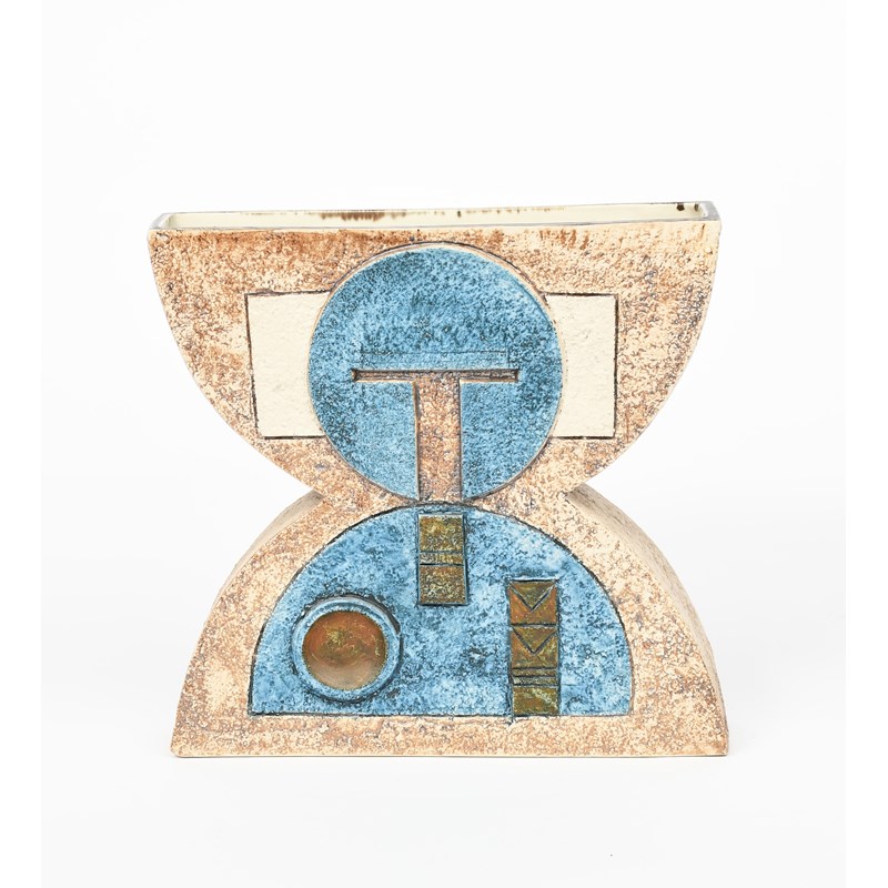 A Troika Pottery Anvil vase by Penny Broadribb, moulded in low relief with a stylised figure, the reverse geometric panels, in blue and cream on a buff ground, painted Troika England and PB artist monogram, 21.5cm. high, 22cm wide.