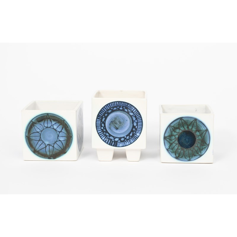 A Troika Pottery footed Cube vase by Anne Lewis, square section stencil decorated with a roundel to each side in blue and black on a white ground, and two Troika Pottery white Cube vases similarly decorated painted Troika Cornwall England and AL artist monogram, minor professional restoration to one cube, 11cm. high, (3)