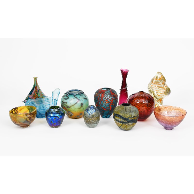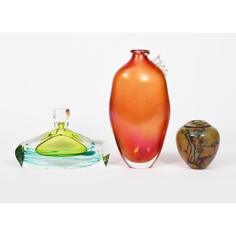 hot sculpted clear glass with gold leaf, one of two produced, a Peter Layton vase, a Jane Charles large bottle and stopper, a red glass vase by Patricia Stern and thirteen other small glass items,