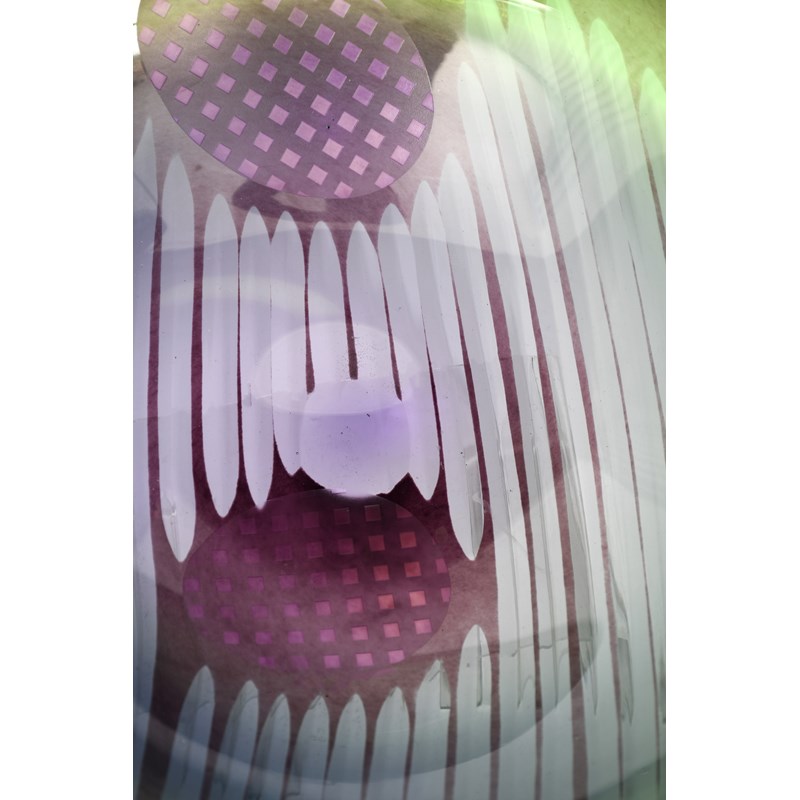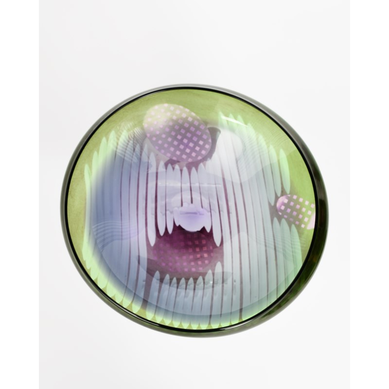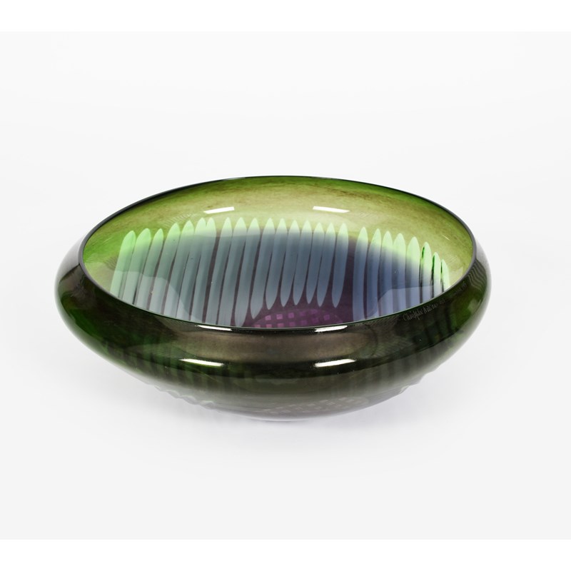 a glass bowl with inverted rim, green and aubergine glass with cut and acid etched geometric design to interior and exterior, unsigned, 34cm. diam.