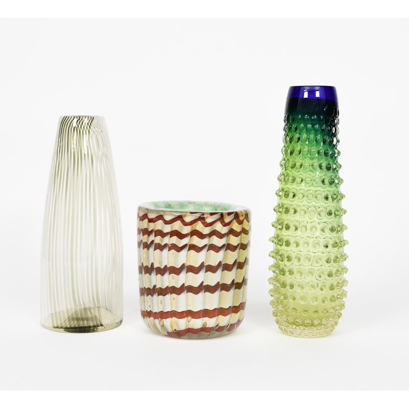‡ An Italian glass vase in the manner of Dino Martens, swollen cylindrical form clear glass internally decorated with white and green vertical line panels, another cased glass vase and a lime green graduating to blue textured glass vase unsigned, 28.5cm. high, (3)