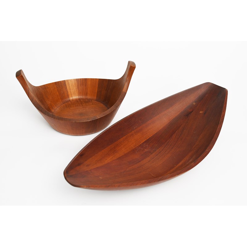 A large Staved Danish teak 'Longboat' fruit bowl designed by Jens Quistgaard, pulled elliptical form, and another Danish teak twin-handled bowl designed by Jens Quistgaard, impressed marks, both with JHQ mark, 60.5cm. wide (2)