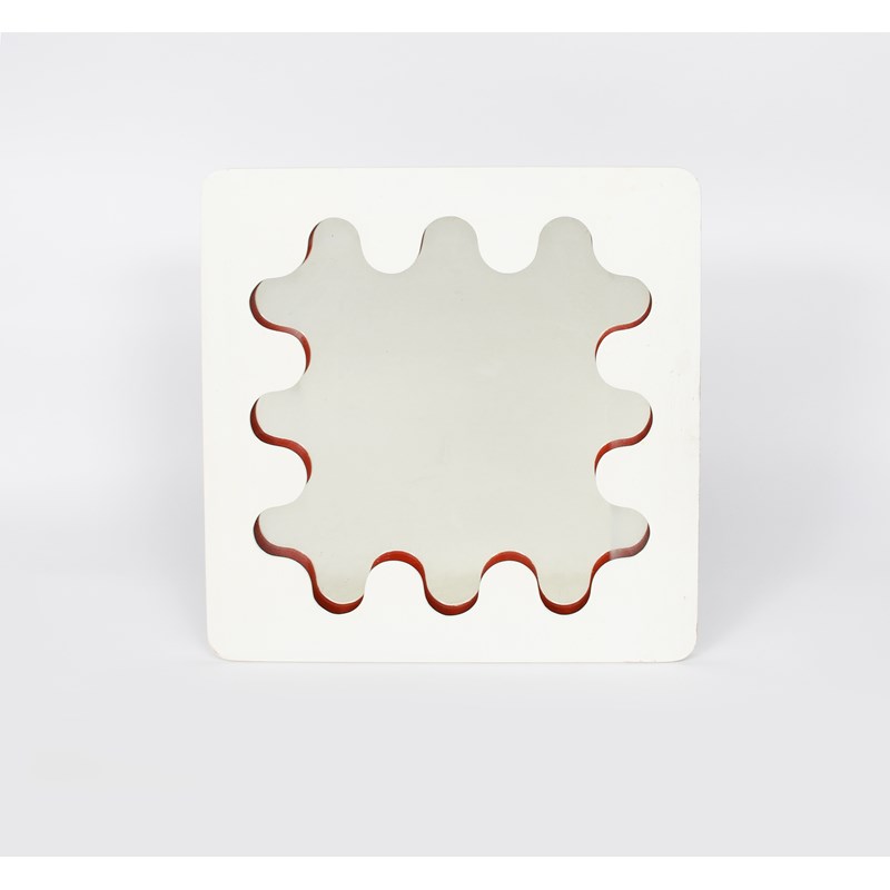 A Makepeace painted wood wall mirror probably designed by John Makepeace, square form with rounded corners and cut wavy border, painted white unsigned, 42.5cm. square