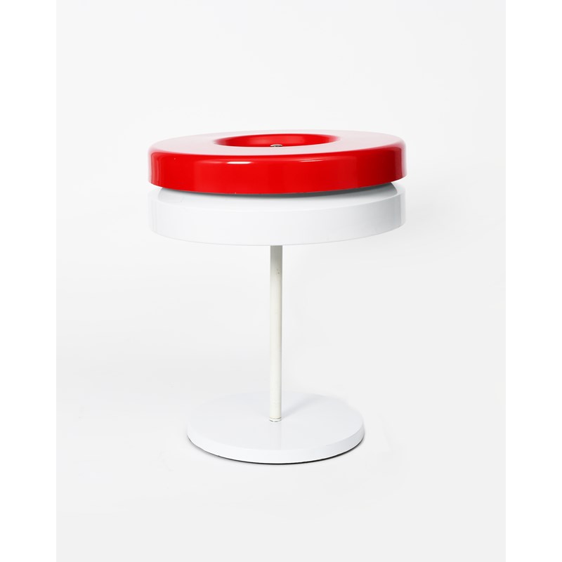 A Kundalini Toric table lamp designed by Patrick Norguet, enamelled white disc base and stem supporting red and white disc shade, label to base, 46cm. high, 37cm. diam.