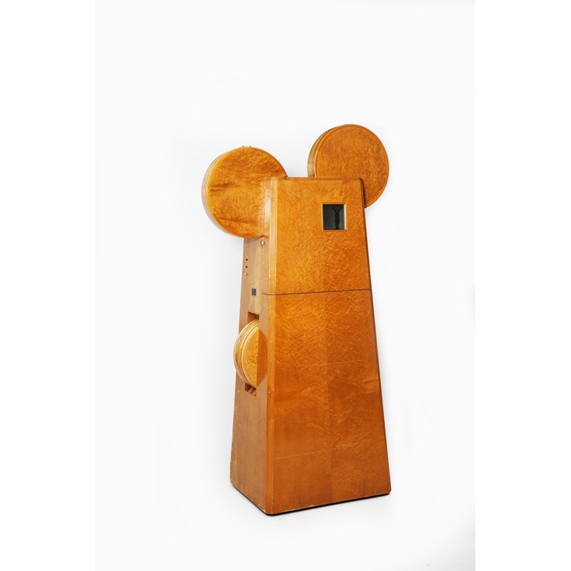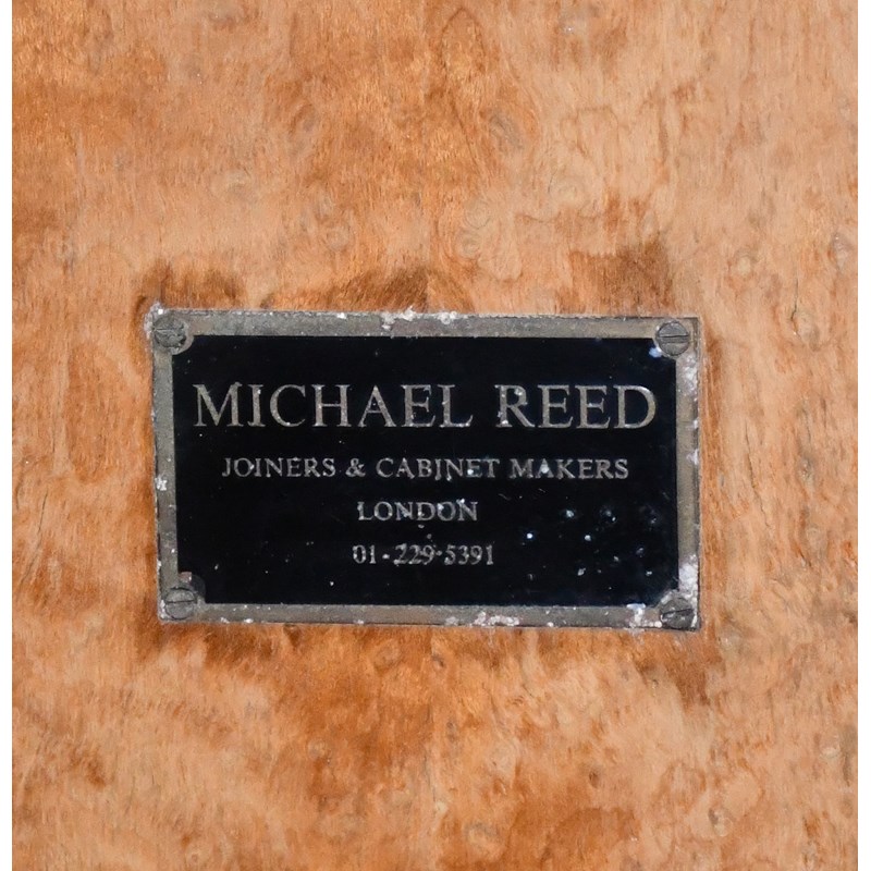 A Bird's eye maple film projector case by Michael Reed Design, commissioned by Lord Lew Grade, 1992, the door set with small window engraved with portrait of Lew Grade and facsimile signature, with three bird's eye maple circular film cases, applied makers label, 198cm. high, 105cm. wide