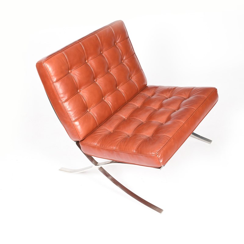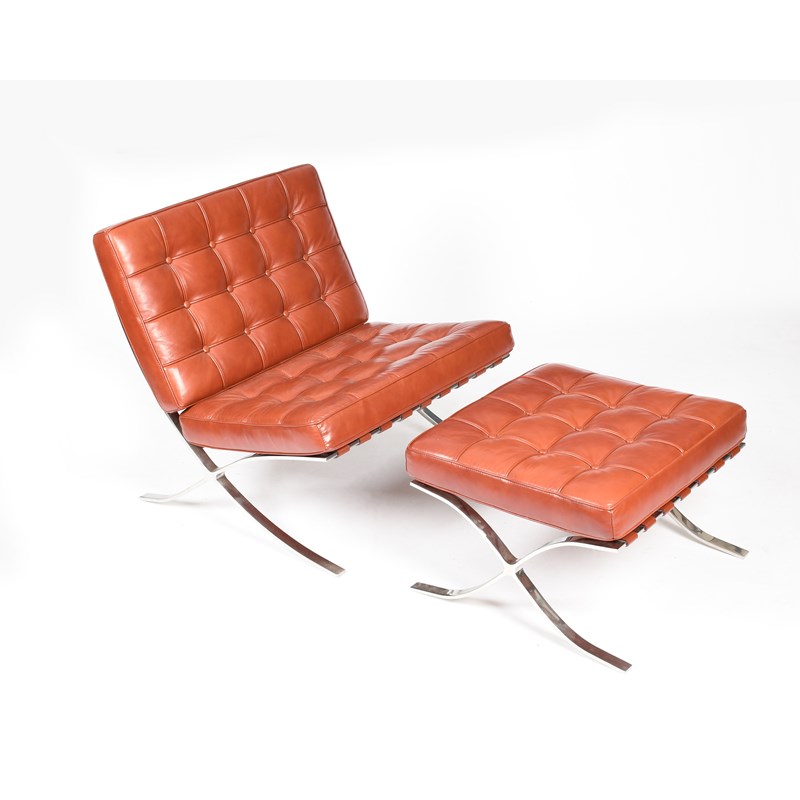 A modern Barcelona chair and ottoman after the original design by Ludwig Mies Van Der Rohe, polished steel frame with padded Nasturtium leather cushions, unmarked, 76cm wide, 77cm high (chair) (5)
