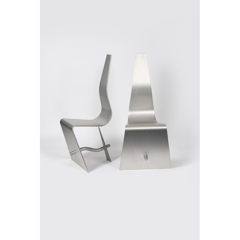a pair of One Off Horns chairs, designed 1985 and made 1986 for Bureaux, single piece aluminium with steel tube,