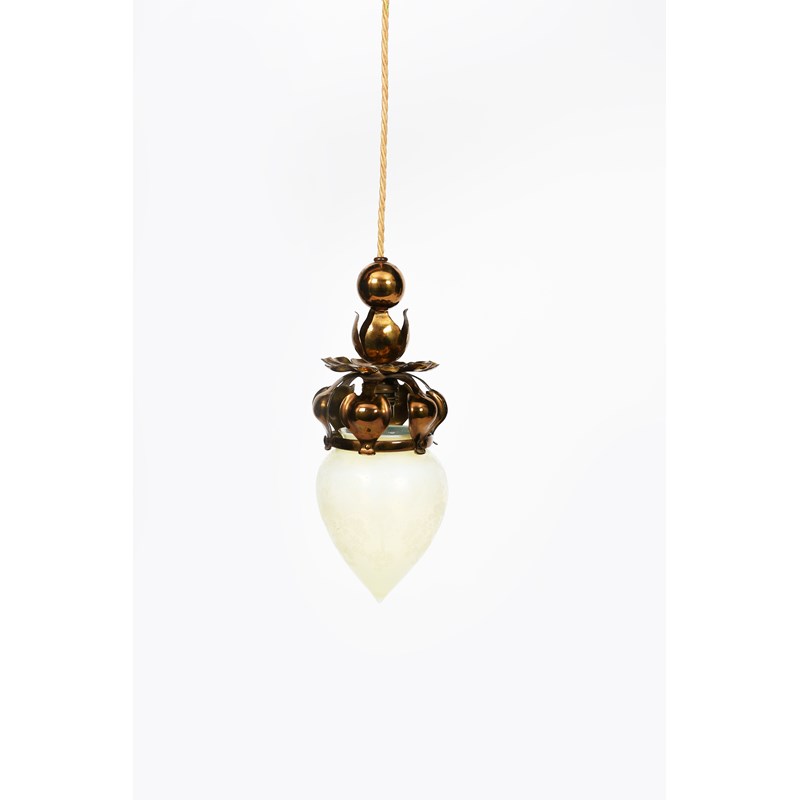 An Art Nouveau patinated brass ceiling pendant light with vaseline glass shade in the manner of WAS Benson, floriform, the vaseline glass teardrop shade with etched floral panels, unsigned, 26cm. drop