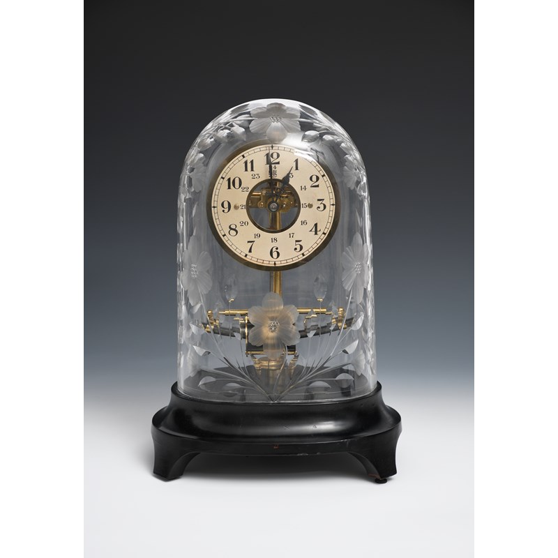 A modern Bulle patent electric clock, on ebonised wood base, the glass dome cut and etched with flowers and foliage unsigned, 37.5cm. high