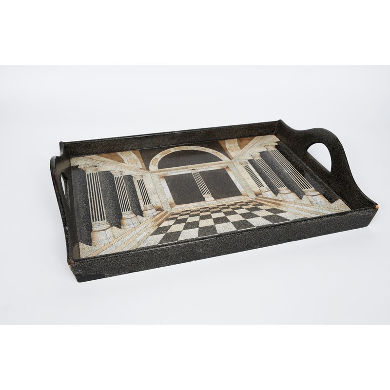 An Italian inlaid twin-handled tray, in the manner of Pierro Fornasetti, rectangular inlaid with a classical interior, unsigned, 61 x 41cm.