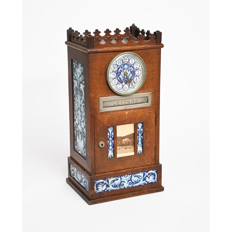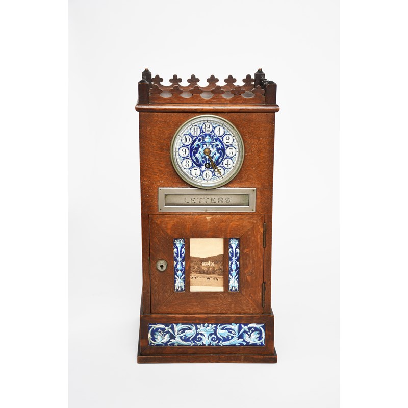 An Aesthetic Movement oak mantle clock with letter box in the manner of Lewis Foreman Day, rectangular form with trefoil over-mantle, the metal letter box with hinged wood door with photographic castle panel, inset with blue ceramic tiles with classical scroll design, the circular ceramic dial with Arabic numerals, crack to dial panel, 43.5cm. high