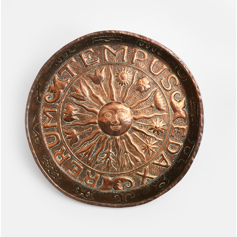 A large repousse copper Zodiac wall charger probably by John Pearson, the circular deep walled vessel hammered to the well with a stylised sun with radiating ray and flower stem design, inside inscription Tempus Edax Rerum, (time that devours all things), and stylised fish motif, the rim with zodiac signs, unsigned, 48cm. diam.