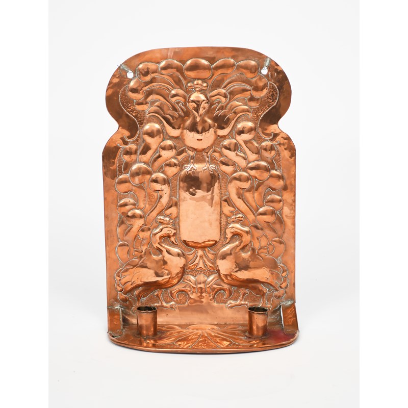 A twin-light copper wall sconce, shaped rectangular back-plate stamped in low relief with three peacock birds, the two sconce tray with stamped foliate motif, unmarked, 36cm. high