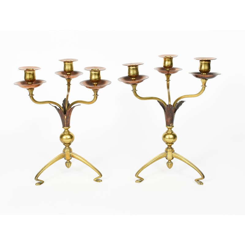 A pair of WAS Benson copper and brass three-light candlesticks, model no.22A, on angled tripod feet, knopped stem with copper foliate decoration, flaring three branch neck with sconces, unsigned, 34.5cm. high, (2)