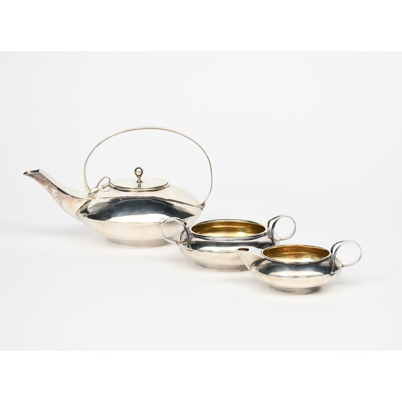 A William H Haseler silver three piece tea set designed by Archibald Knox for Liberty & Co, model no.5342, comprising teapot and cover, milk-jug and twin-handled sugar basin, Japoniste form, the teapot low compressed body with slender spout and sinuous strap handle, stamped marks, WHH to teapot Birmingham 1905, milk and sugar Liberty & Co Birmingham 1906, 13cm. high, 15.5ozt, (4)