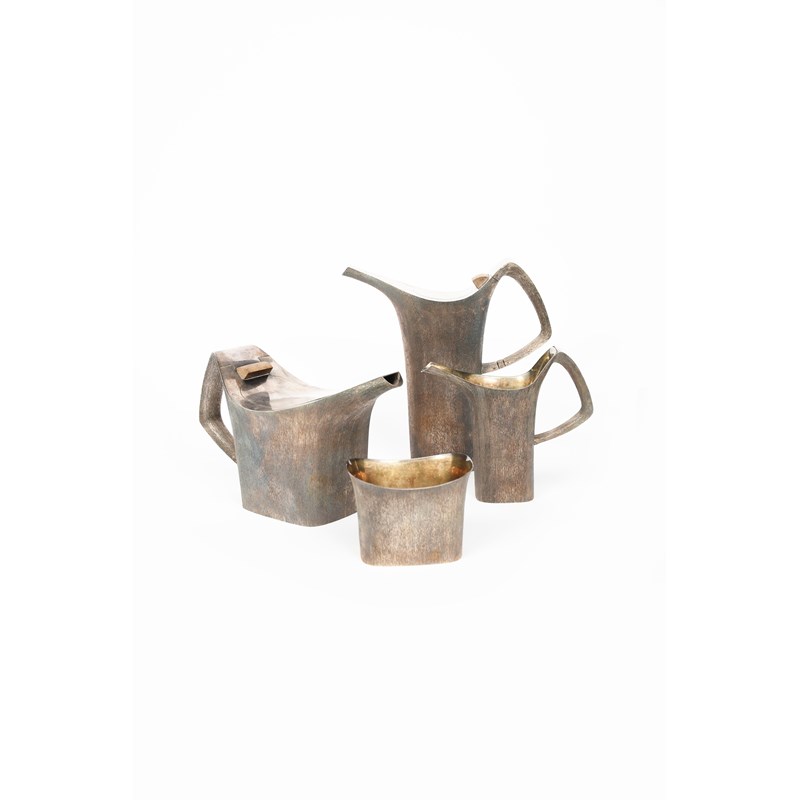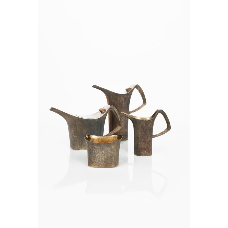 A fine silver four piece tea set by Christopher Lawrence, streamlined form with textured surface, comprising tea pot and cover, a tall hot-water pot and hinged cover, sugar basin and milk jug, the teapot and hot-water pot with wood cover handles, stamped marks CL London 1971, 24cm. high (hot-water pot), 89.8ozt, (4)