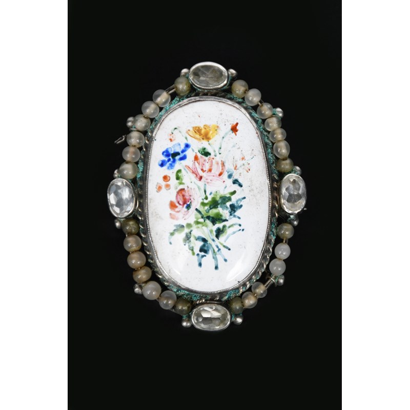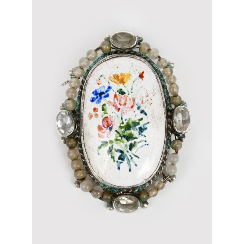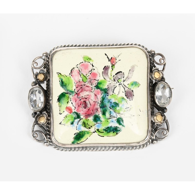 A George Hunt silver and enamel brooch, oval wirework frame set with four cut colourless pastes and simulated pearl border, central oval enamel painted with wild flower bouquet in colours and another George Hunt silver and enamel brooch unsigned, 5cm. long (2)