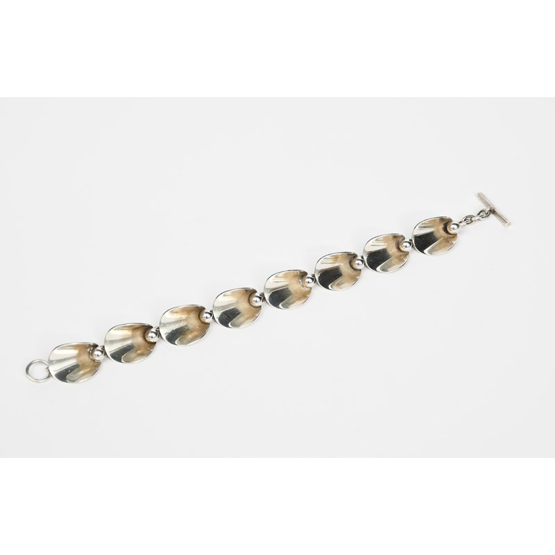 An N E From silver link bracelet, eight petal shaped links each with ball motif, stamped marks, 19cm. long