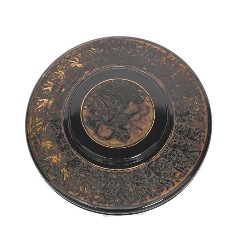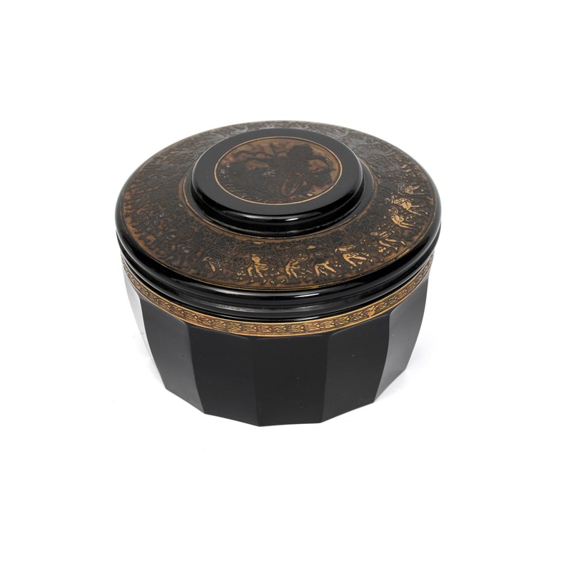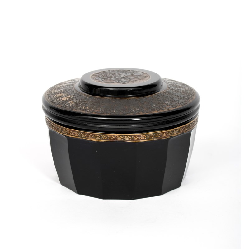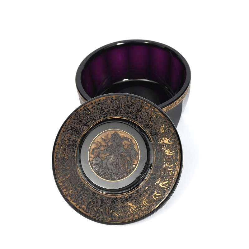 A Moser glass box and cover, purple glass faceted box with thin acid etched foliate border highlighted in gilt, the circular stepped cover with a broad acid etched band of Classical figures, the shallow, circular knop with a seated classical warrior maiden, etched Moser Karlsbad, 13.5cm. diam. (2)