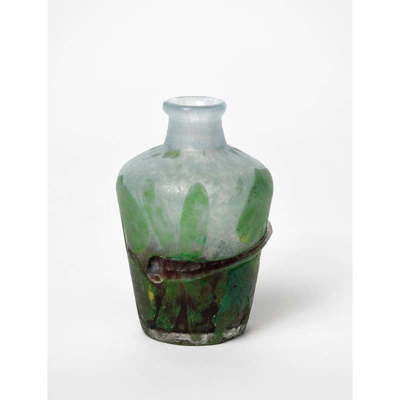 A rare Art Nouveau miniature Daum Nancy cameo glass vase, shouldered, cylindrical form with applied amber glass dragonfly, the surface acid etched with water-lily pads, on a mottled pale blue body, etched Daum Nancy to vase, chip to foot rim, 7.5cm. high