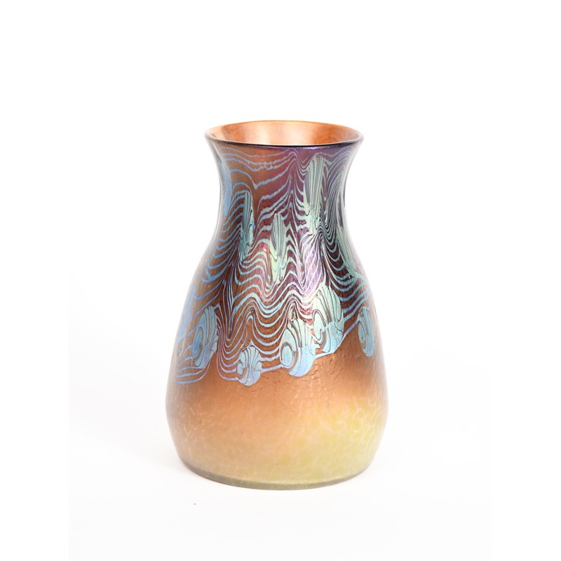 An Art Nouveau Loetz iridescent glass vase, shouldered form, trailed iridescent design to shoulder on textured golden lustre glass body, etched Loetz Austria, 17.5cm. high