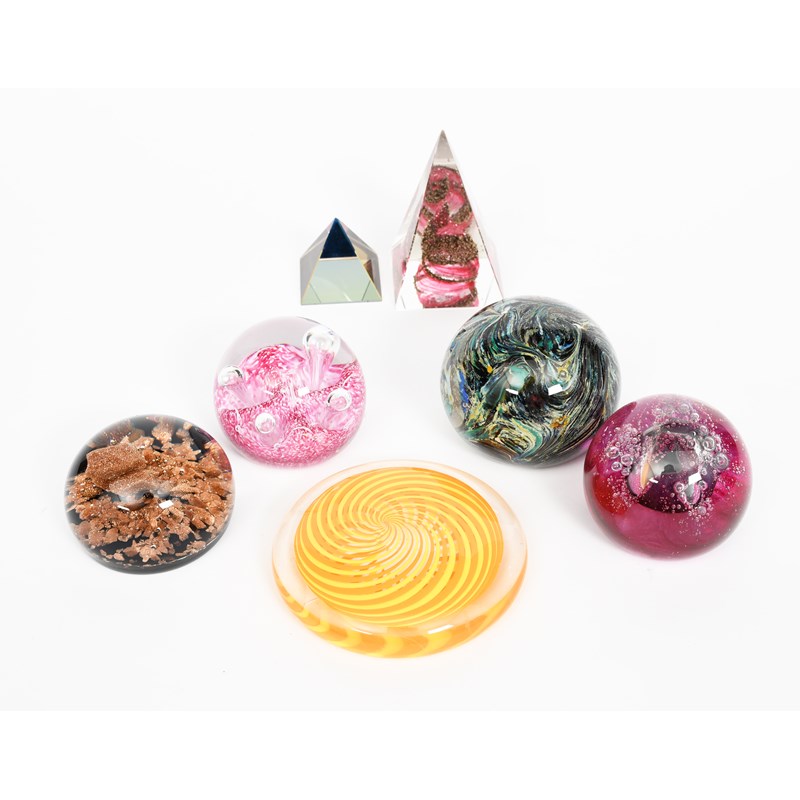 A Venini glass paperweight, alternate yellow and orange stripes, cased in clear, A Murano glass paperweight dated 1980, decorated with aventurine, a Caithness Fireball paperweight, two other paperweights and two glass pyramid weights, etched Venini Italia, 12cm. diam. (7)