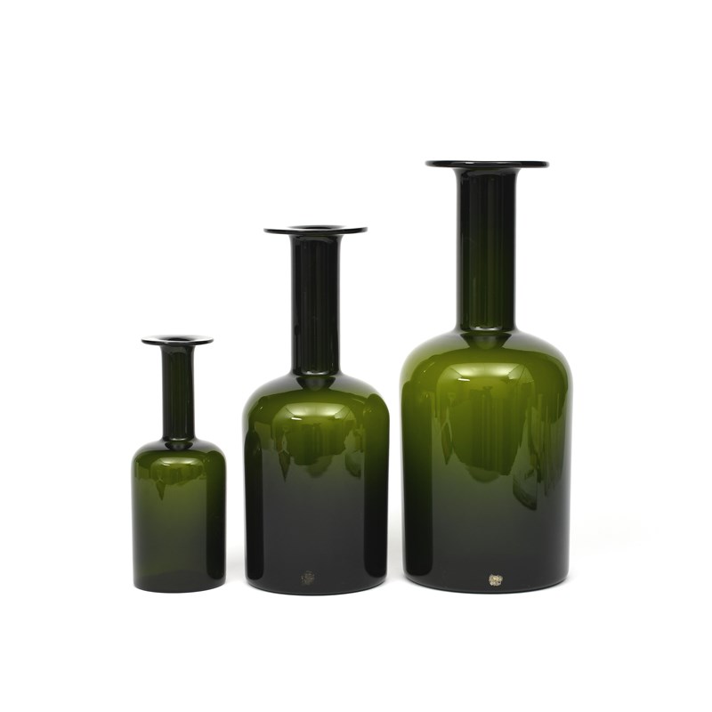 A graduated set of three Holmegaard Gulvase designed by Otto Brauer, shouldered cylindrical body with slender cylinder neck and flaring rim, remains of label to one, 43cm. high (tallest), 25cm. high (smallest), (3)