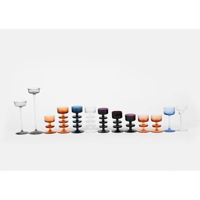 A Wedgwood dark blue glass Sheringham three tier candle holder designed by Ronald Stennett-Willson, another three tier amethyst glass candle holder, seven other Sheringham candle holders, two graduated Wedgwood candle holders, a Wedgwood Sapphire Brancaster candle holder and a clear Helix shaped candle holder, applied Wedgwood label to one, 15.5cm. high (dark blue Sherringham), (13)