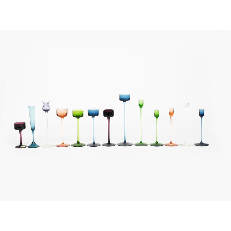 A Wedgwood green glass Sandringham candle holder designed by Ronald Stennett-Willson, another shorter, three other Wedgwood Sandringham candle holders, six Wedgwood Brancaster candle holders, a tall thin flute and another with thistle bowl,one with paper label, 25.5cm. high (tallest green Sandringham), (13)