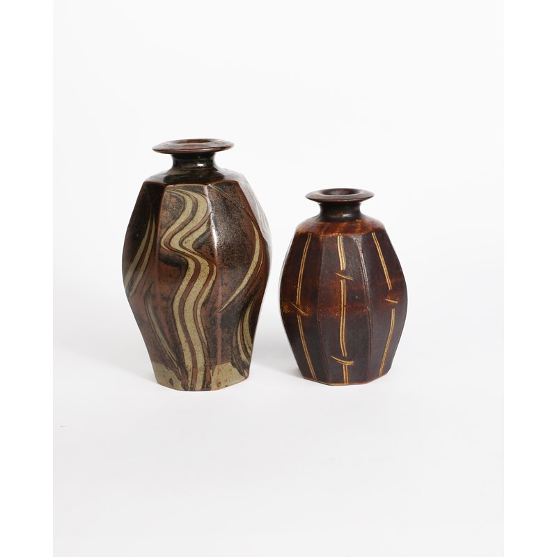 a cut-sided stoneware bottle vase, with flaring rim, covered to the foot with a tenmoku glaze with combed column design, and another smaller cut-sided stoneware vase by John Jelfs