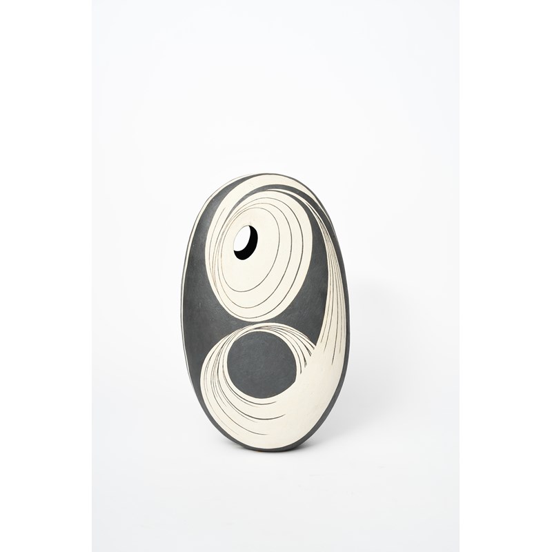 a tall oval vase with pierced hole, painted black and white optical design to both sides,