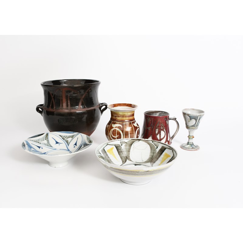 an Aldermaston Pottery tankard, painted in rich red lustre glaze, an Aldermaston Pottery vase, a footed bowl by Julian Bellmont, a small Aldermaston Pottery goblet and bowl, and a twin-handled vase resist decorated with a geometric band,