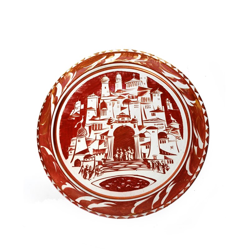 a large and impressive Aldermaston Pottery charger, golden-red lustre on a tin-glaze
