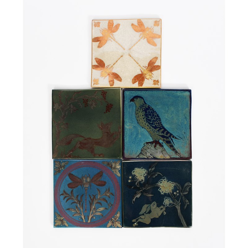 a set of five hand-built lustre tiles, each painted with dragonfly, fox, hare and falcon motif,