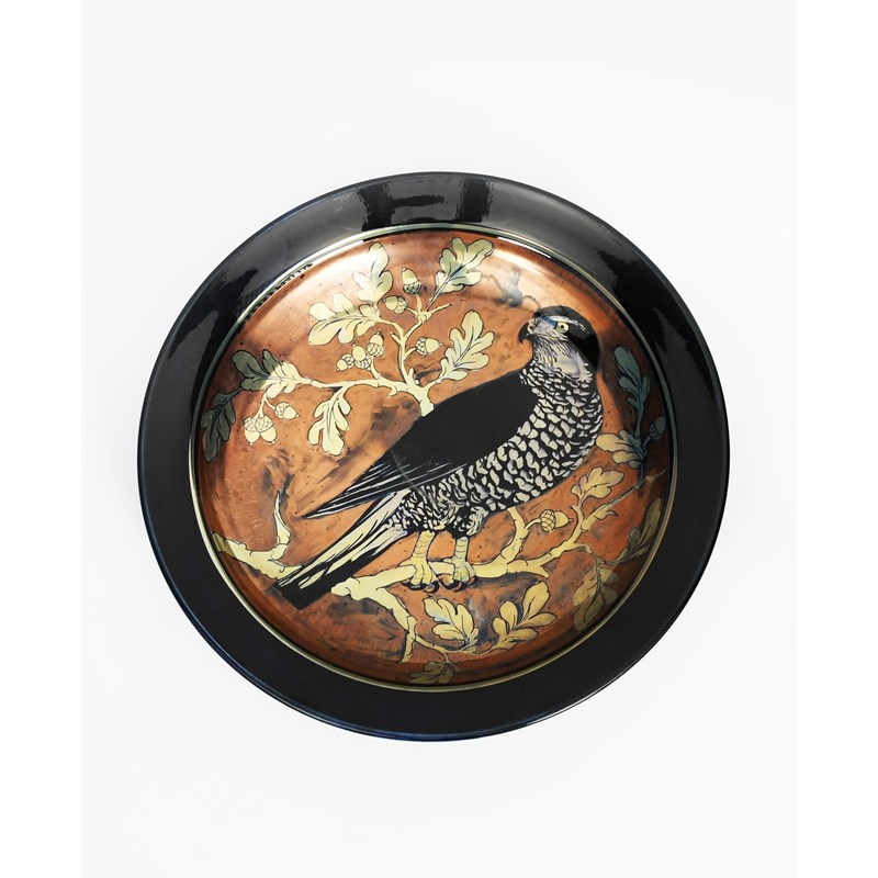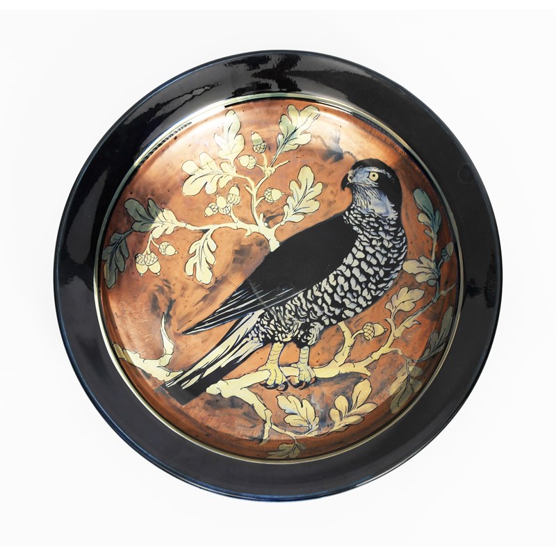 a pottery wall charger, painted to the well with a bird of prey perched in an oak tree, glazed in copper and golden lustre on a deep blue ground