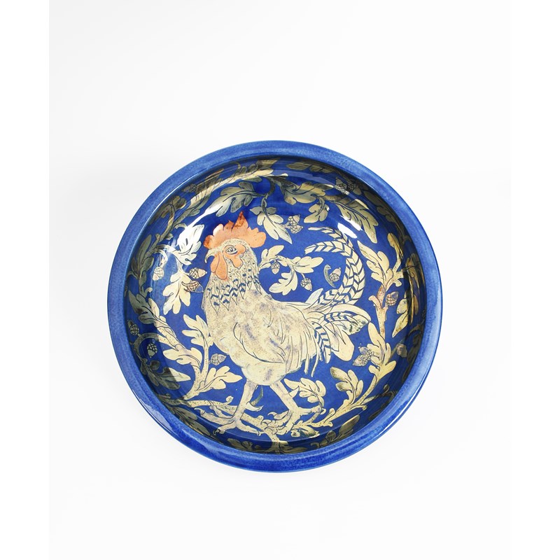 a pottery deep welled wall charger, painted with a cockerel amongst oak boughs, in gold and ruby lustre on a blue ground,