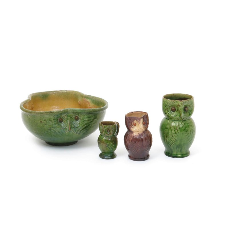 Three Farnham Pottery owl jugs probably retailed by Liberty & Co, graduated sizes, glazed in brown and green, a bowl similar and two other items unsigned, chips, tallest owl jug 13cm. high (6)