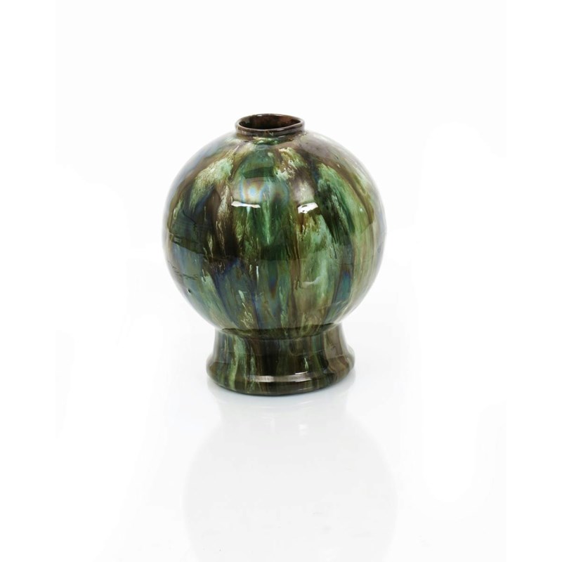 A rare Linthorpe Pottery vase designed by Dr Christopher Dresser, ovoid with cylindrical foot, covered in a running green and brown glaze apparently unsigned 17cm. high